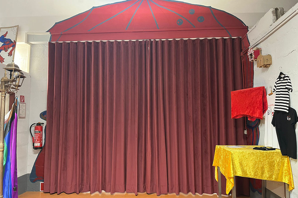 Für die richtige Atmosphäre sorgt nun auch ein echter Vorhang im Foyer, welcher bereits als Kunstwerk seit vielen Jahren die Vision davon zeigte. Neben einer optischen Verschönerung hilft auch dieser uns dabei, dass die Lichttechnik bei Veranstaltungen noch etwas besser zur Geltung kommt.